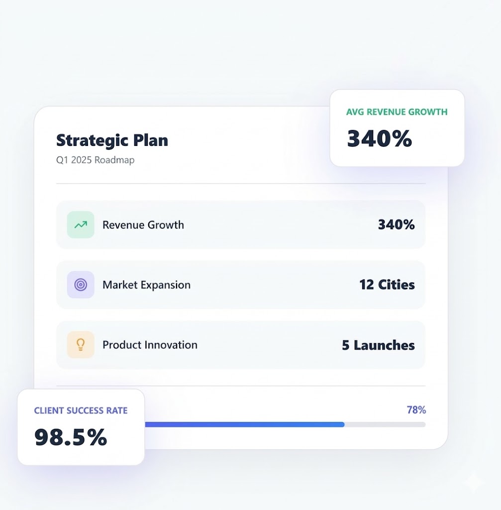 While every business is different, our clients average 340% revenue growth within 18 months of implementing our strategies. We’ve helped companies raise $200M+ in funding, expand to new markets, improve unit economics by 50%+, and achieve category leadership. We set clear KPIs upfront and track progress rigorously. Our 98.5% success rate speaks to our commitment to measurable outcomes.