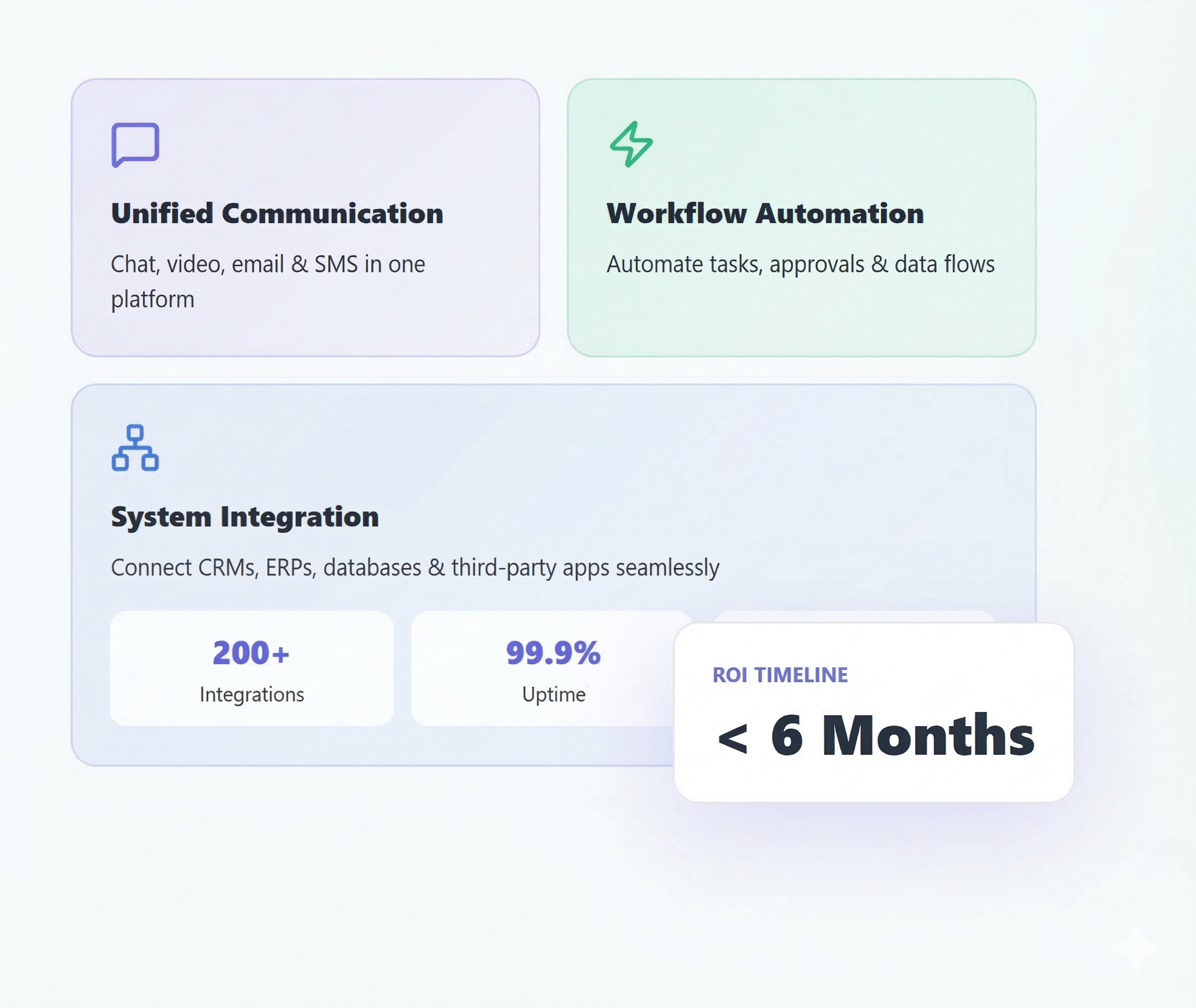 Our clients typically see ROI within 6 months. Common benefits include: 60-75% reduction in manual task time, 40-50% improvement in response times, 30-40% increase in team productivity, and 80-90% reduction in errors. We provide detailed ROI projections during the discovery phase based on your specific workflows and pain points.