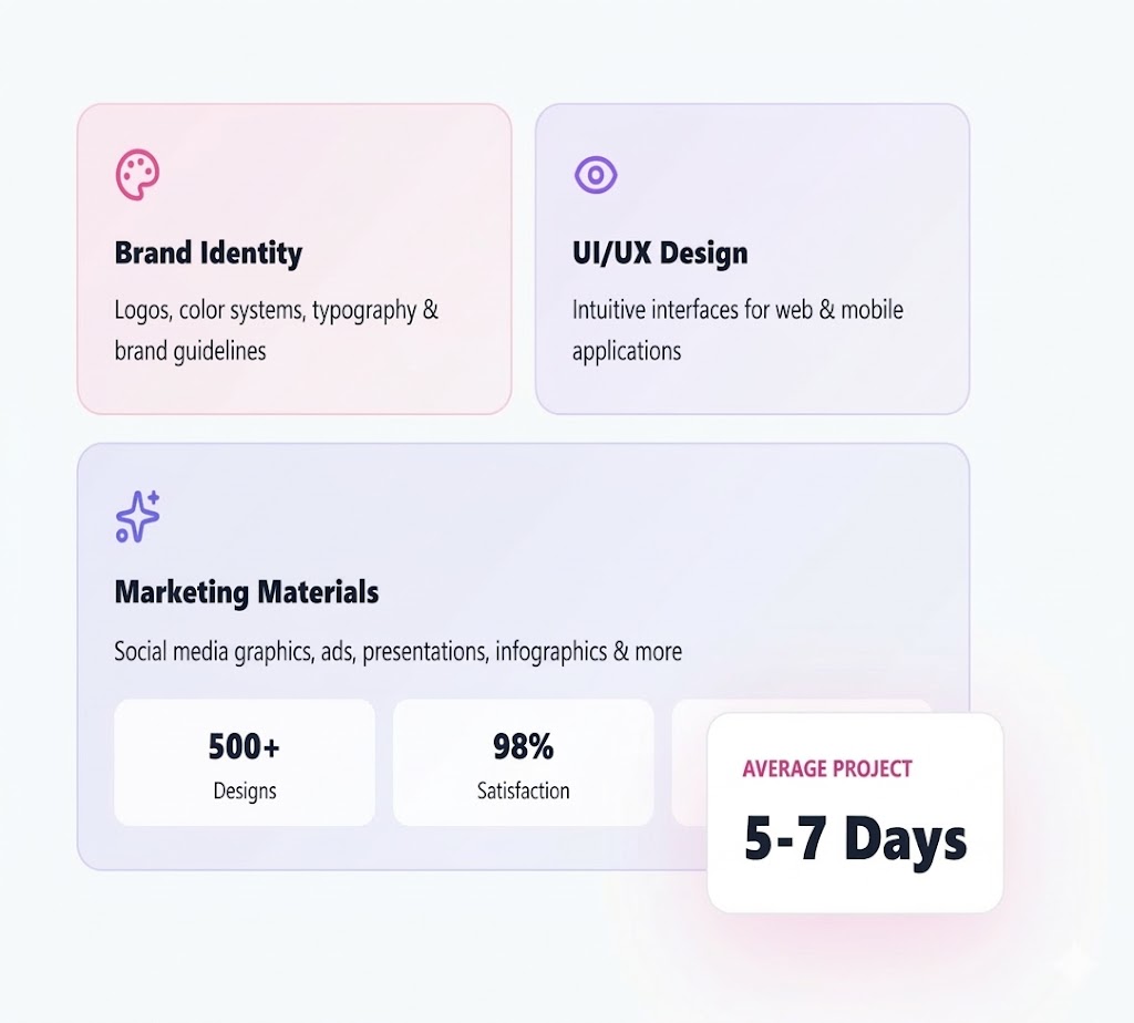 Our typical design process takes 2-4 weeks depending on scope: Discovery & Research (3-5 days), Concept Development (5-7 days), Design Iterations (5-7 days), and Final Delivery with brand guidelines. We provide 2-3 initial concepts and include up to 3 rounds of revisions. For ongoing projects, we offer monthly retainer packages with faster turnaround times.